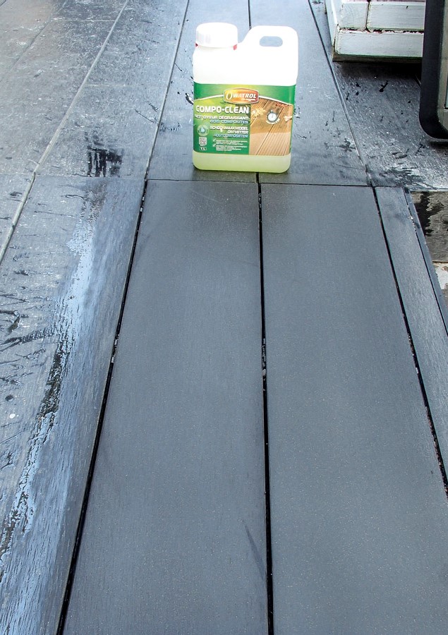 Compo-Clean is a water-based composite wood cleaner and degreaser suitable for use on all types of exterior composite wood.